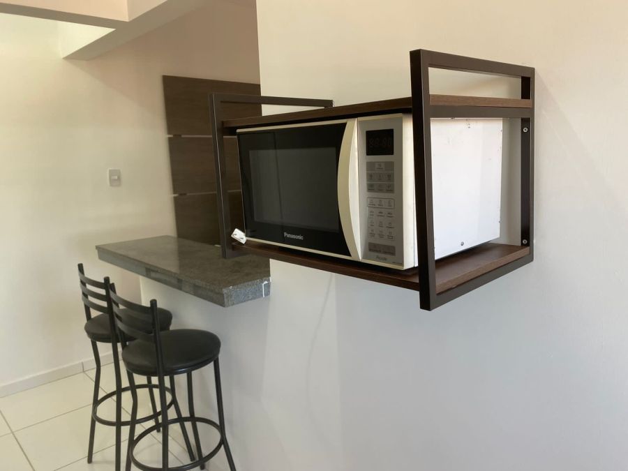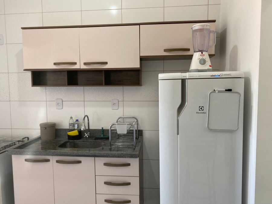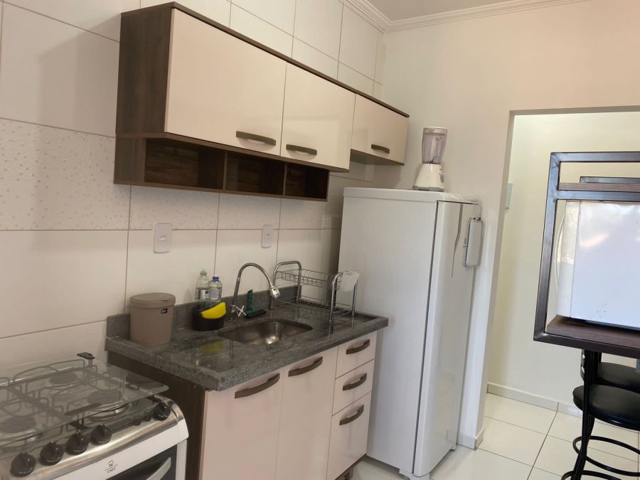 Cozinha funcional com armário, fogão, geladeira e micro-ondas
